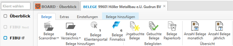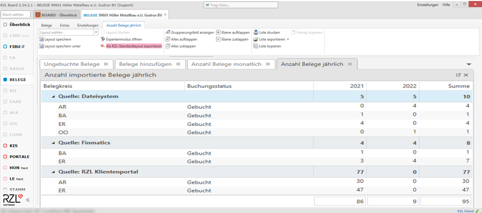 In dieser Anzeige wird angezeigt, wieviele Belege pro Jahr (bzw. in Summe), Belegkreis und Quelle (z.B. Dateisystem, Klientenportal, Finmatics, …) hinzugefügt wurden.