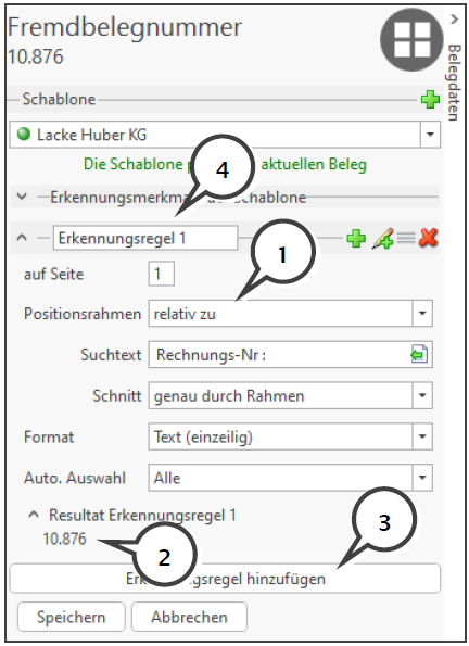 Zusätzlich haben Sie die Möglichkeit mit der Funktion Erkennungsregel hinzufügen (3) weitere Erkennungsregeln für dasselbe Feld anzulegen, falls bei diesem Rechnungsaussteller die Fremdbelegnummer auf verschiedene Arten ausgelesen werden muss (z.B. deutsche und englische Rechnungen oder relativ zu Rechnung bzw. Teilrechnung oder Gutschrift).