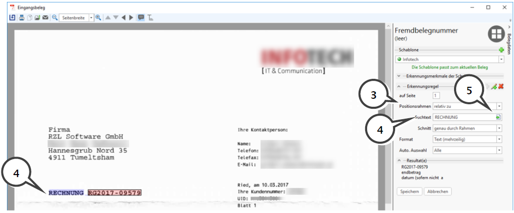 Ansonsten markieren Sie bitte den Suchtext innerhalb der Rechnung mit der Maus (hier: RECHNUNG) und klicken Sie in der Zeile Suchtext auf das Einfügen-Symbol (5). Somit wird die Bezeichnung des gewünschten Suchtextes (Bezugspunkt) eingetragen.