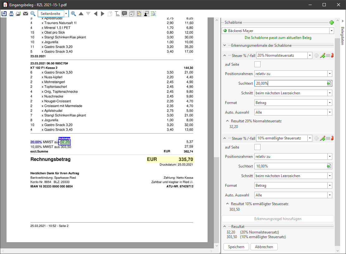 Somit werden in Zukunft bei Rechnungen dieses Rechnungsausstellers die Steuerzeilen 10 % und 20 % immer ausgelesen, wenn sie am Beleg vorkommen.