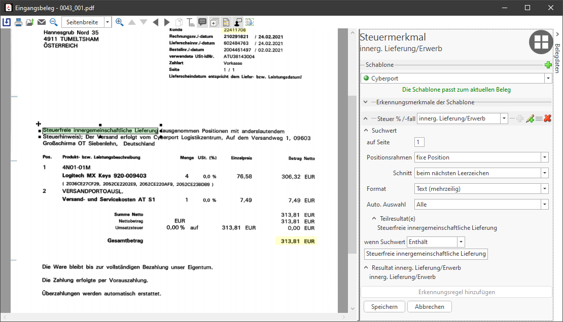 D.h. diese Schablone wird künftig nur verwendet, wenn diese UID-Nummer auf dem Beleg an der entsprechenden Stelle ausgelesen wird. Die UID-Nummer sollte als bevorzugtes Erkennungsmerkmal für spezielle Schablonen verwendet werden. Natürlich kann auch der z.B. der Name des Rechnungsausstellers im Briefkopf verwendet werden.