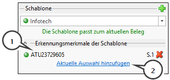 Ist die UID-Nummer nicht lesbar oder nicht vorhanden (z.B.: Kleinunternehmer) oder sollen mehrere Erkennungsmerkmale verwendet werden, markieren Sie die Information am Beleg und klicken auf die Schaltfläche Aktuelle Auswahl hinzufügen in der Schablone (2) eingetragen.