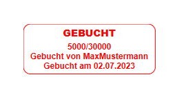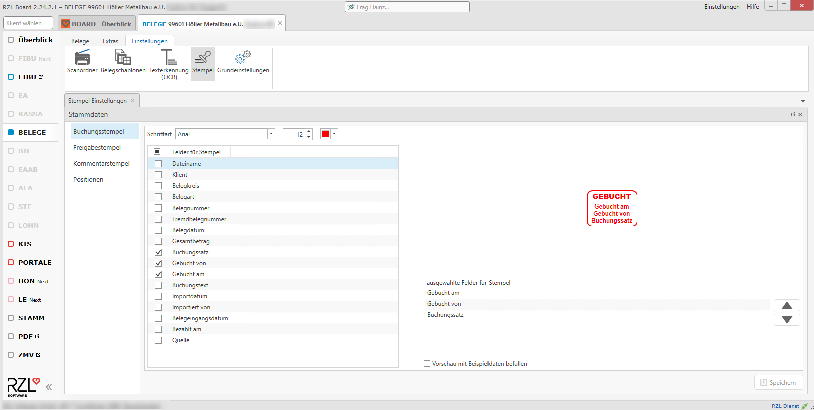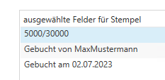 In diesem Menü können Sie den Buchungsstempel für Gebuchte Belege konfigurieren. Sie können festlegen, welche Felder am Stempel Gebucht in welcher Reihenfolge angezeigt werden sollen.