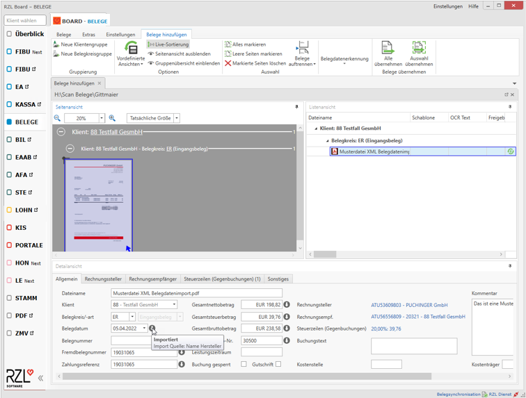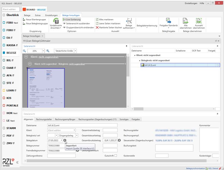 Diese Belege können dann entweder über einen Scanordner oder auch über den oben beschriebenen Menüpunkt Belege mit XML importieren übernommen werden. Somit ist bei RZL zumindest für die Felder, die über die XML-Datei geliefert werden, keine Belegdatenerkennung mehr notwendig.