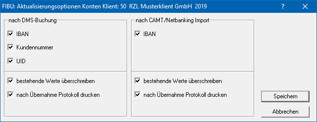 Öffnen Sie dazu in der FIBU den Menüpunkt Stamm / Konten/ Aktualisierungsoptionen. Hier können Sie im Bereich nach DMS-Buchung aktivieren, dass nach dem Buchen von digitalen Belegen die Daten (IBAN, Kundennummer, UID) vom Beleg in die Kontenstammdaten übernommen werden sollen.