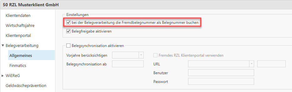 Wenn Sie stattdessen bei der Belegverarbeitung die Fremdbelegnummer als Belegnummer buchen möchten, können Sie in den Klienten-Stammdaten im RZL Board im Bereich Belegverarbeitung / Allgemeines pro Klient diese Option aktivieren.