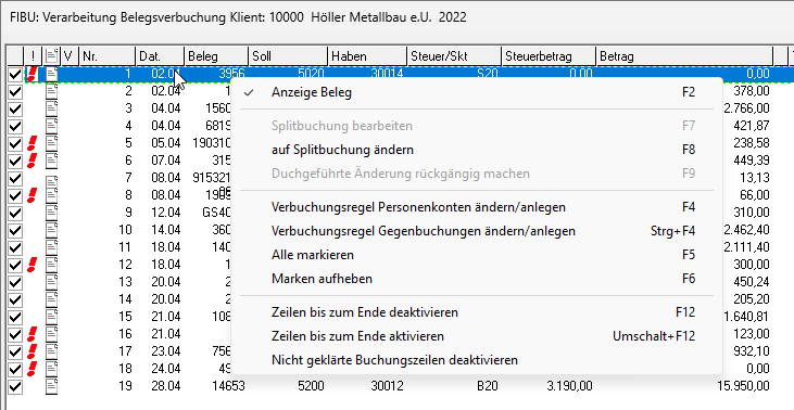 Buchungszeilen ab der aktuellen Zeile können für die Verbuchung deaktiviert werden. Diese Belege bleiben somit als ungebucht erhalten und werden nächstes Mal wieder vorgeschlagen.