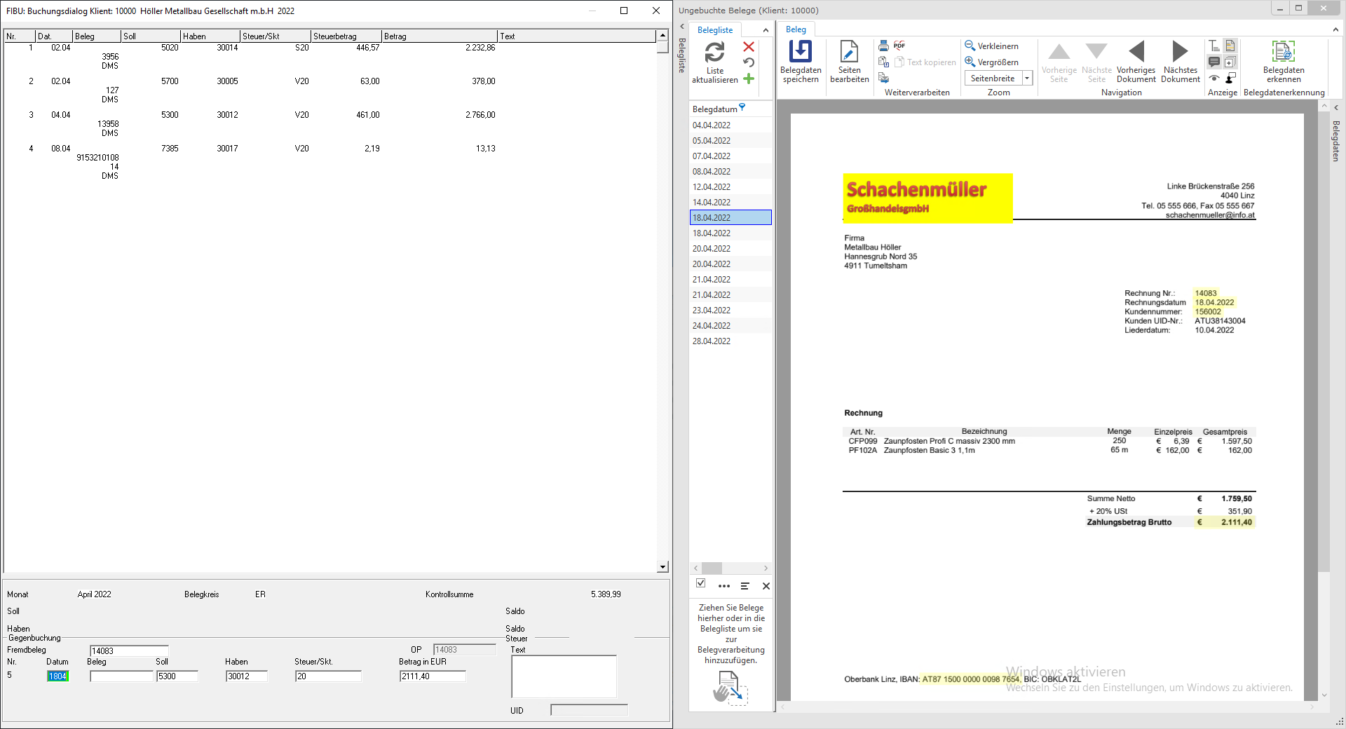 Wenn der Buchungssatz dann abgeschlossen ist (im Buchungsdialog oben aufscheint) wird der verknüpfte Beleg aus der Liste der ungebuchten Belege herausgelöscht und als gebucht markiert. Anschließend wird automatisch der nächste Beleg markiert und die Werte wieder in die Buchungszeile eingetragen (mit der Funktion automatisch im Vordialog).