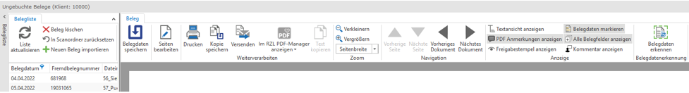 Der aktuell in der Belegliste markierte Beleg wird beim Erfassen einer Buchung dem Buchungssatz hinterlegt, als gebucht markiert und in der Belegverarbeitung im RZL Board die Buchungsdaten gespeichert.