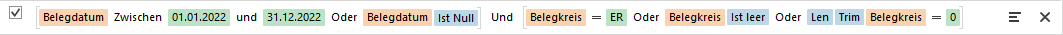 Dieser Filter kann mit der Checkbox links deaktiviert werden, um alle vorhandenen, ungebuchten Belege anzuzeigen (unabhängig von Datum und Belegkreis). Mit dem x-Symbol wird der Filter für den aktuellen Buchungsvorgang zur Gänze entfernt.