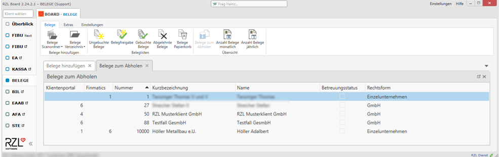 Ohne geöffnetem Klienten finden Sie im Bereich BELEGE / Belege / Belege zum Abholen eine Übersicht aller Klienten mit der Anzahl der noch abzuholenden Belege vom Klientenportal oder von Finmatics: