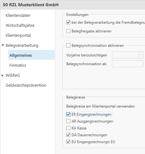 In den Stammdaten des jeweiligen Klienten im Bereich Belegverarbeitung / Allgemeines werden die in der FIBU / EA angelegten Belegkreise angezeigt. Sie können nun hier steuern, welche Belegkreise der Klient bzw. die Außenstelle am Klientenportal auswählen kann.