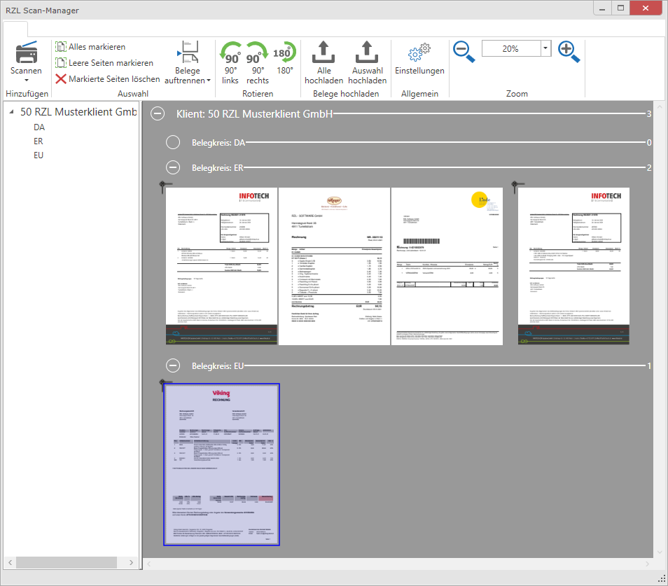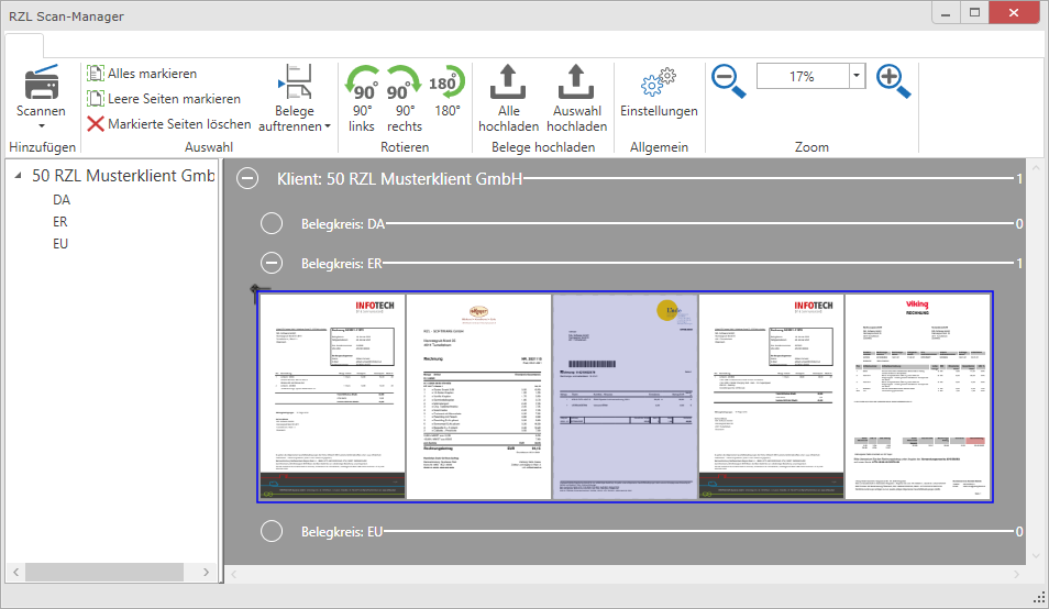 Falls Ihr Klient die Belege vor dem Hochladen noch aufbereiten möchte (Seiten trennen, zusammenfügen, drehen, löschen usw.), kann der RZL Scan-Manager verwendet werden (Belegbox / Belegscanmanager starten).
