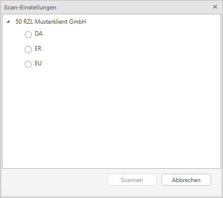 Nach Auswahl und Klick auf den gewünschten Scanner wird ein Vordialog angezeigt, wo der Belegkreis (und ev. der Klient) ausgewählt werden muss.