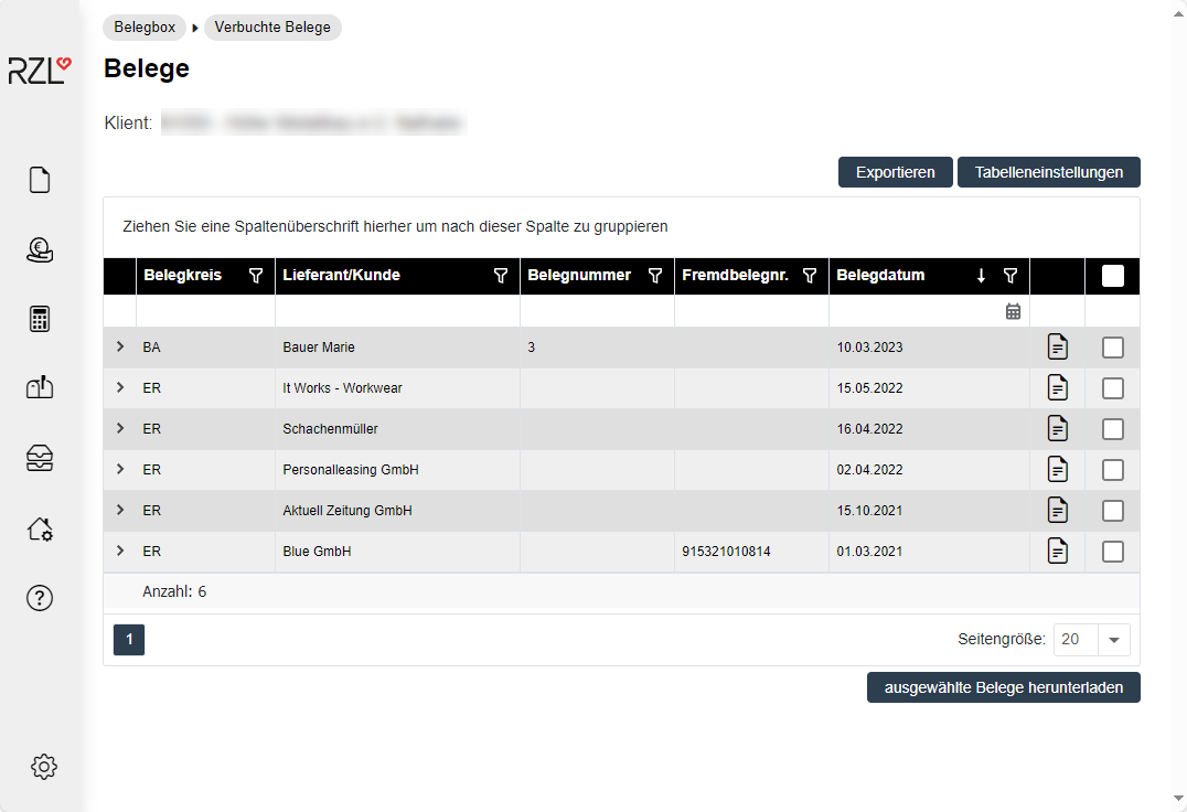 Die Belegliste kann über einfache Such-/Gruppier- und Filterfunktionen auf die gewünschten Belege/den gewünschten Beleg eingeschränkt werden.