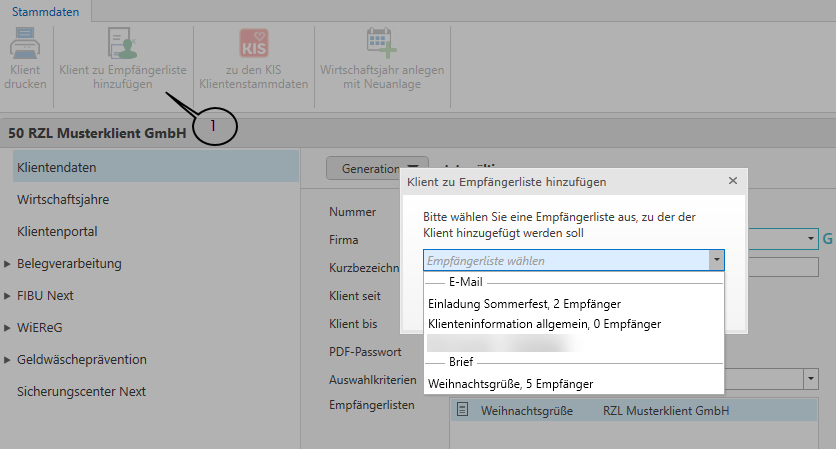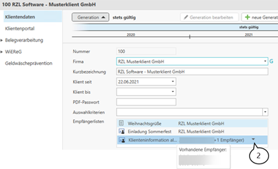 In den Klientenstammdaten wird weiters angezeigt, wer für diesen Klienten in welcher Empfängerliste vertreten ist (2).