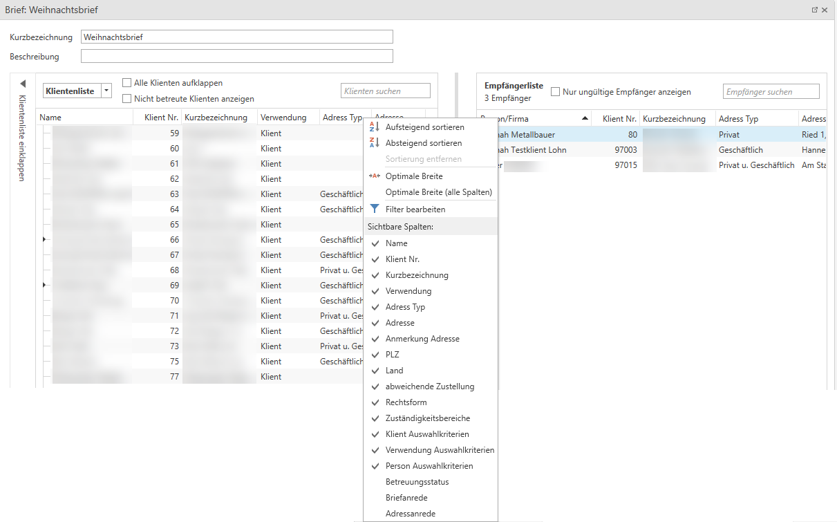 Sie können neben der Erstellung/Bearbeitung einer Empfängerliste im Bereich Serienversand einen Klienten