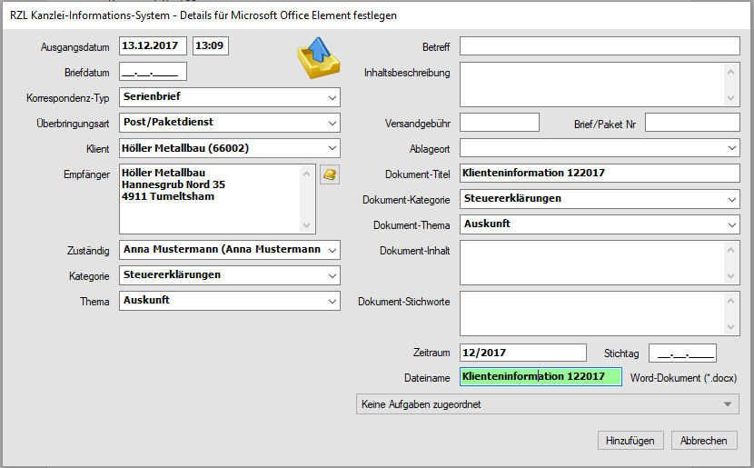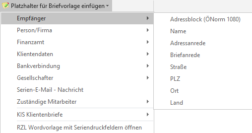 Platzhalter mit fixer Bedeutung/Zuordnung Weiters haben Sie noch die Möglichkeit, Platzhalter für Stammdaten des Klienten selbst im Schreiben einzufügen, um diese automatisch im Rahmen des Serienversands mit Daten aus dem RZL Board befüllen zu lassen.