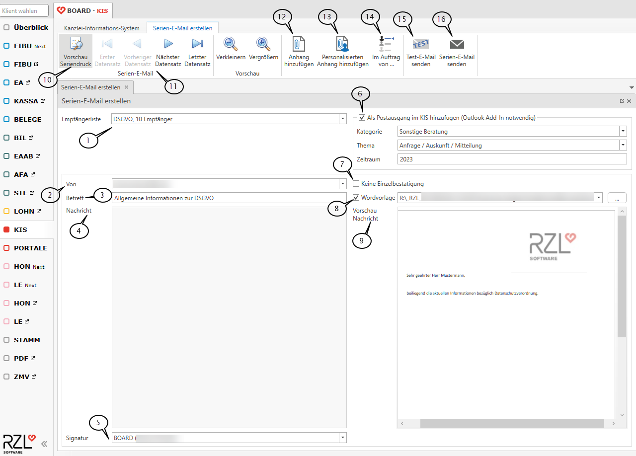 Der Serienversand befindet sich im RZL BOARD im Menüpunkt KIS. Durch Anwahl des Menüpunktes KIS gelangen Sie in den Bereich des Kanzlei-Informations-Systems.