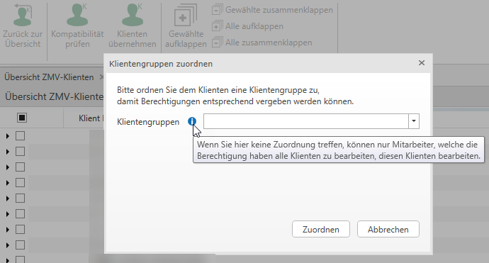 Bei einer ZMV-Klientenübernahme ist ebenso beim Schritt Klienten übernehmen mindestens eine Klientengruppe zu hinterlegen.