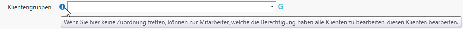 Wird also ein neuer Klient im Board angelegt ist in den Klientendaten mindestens eine Klientengruppe zu hinterlegen. Hinterlegen Sie hier keine Klientengruppe können Sie den Klienten nur noch bearbeiten, wenn Sie die Berechtigung zur Bearbeitung der Stammdaten für alle Klienten besitzen.