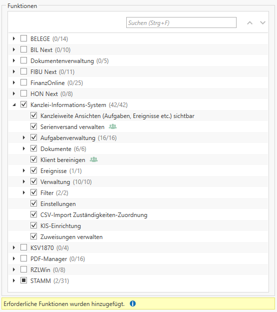Möglichkeit, einzelne von RZL festgelegte Programmfunktionen mit unterschiedlichen Berechtigungen zu versehen