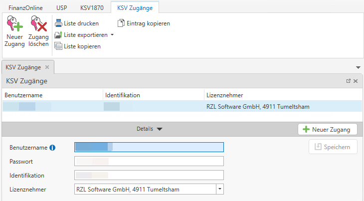 Klicken Sie auf das Icon Zugänge und legen Sie dort über die Funktion Neuer Zugang Ihren KSV1870 Zugang im RZL Board an. Sie haben außerdem die Möglichkeit, einen KSV1870 Zugang zu löschen.