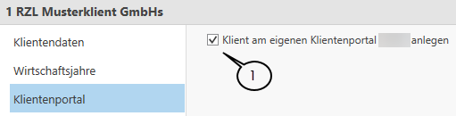 Damit ein Klient grundsätzlich am RZL Klientenportal zur Verfügung steht, muss dies in den Klientenstammdaten im Register Klientenportal aktiviert werden (1).