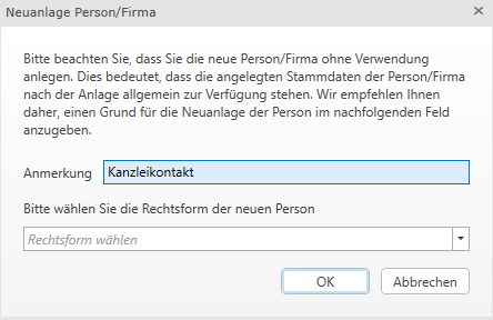 Über die Schaltfläche Neue Person/Firma gelangen Sie in die Neuanlage. Im ersten Schritt ist verpflichtend die Rechtsform auszuwählen.
