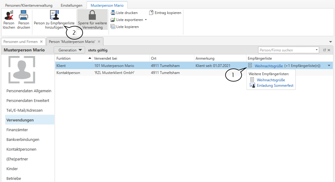 Sie haben weiters die Möglichkeit, die Person in diesem Dialog einer bereits bestehenden Empfängerliste hinzuzufügen. Wählen Sie dazu die Schaltfläche Person zu Empfängerliste hinzufügen (2).