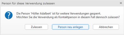 Wenn Sie nun beispielsweise eine bereits bestehende Person neu als Kontaktperson hinterlegen, müssen Sie entscheiden, ob dies in diesem Fall in Ordnung ist. Nach Auswahl einer gesperrten Person erscheint Ihnen folgende Abfrage.