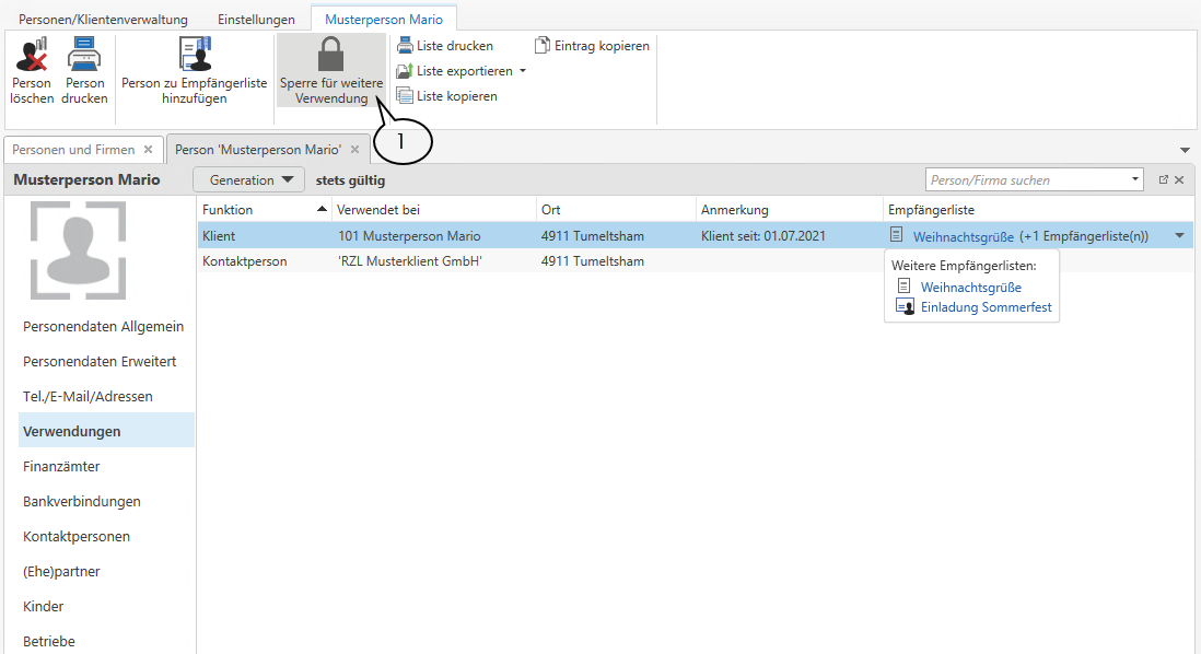 Falls sich eine Person/Firma in einer Empfängerliste befindet, wäre dies ebenfalls unter Verwendungen zu sehen. Ist eine Person gesetzlicher Vertreter und in dieser Verwendung in einer Empfängerliste, dann wird Ihnen die betreffende Empfängerliste in der letzten Spalte angezeigt (1). Ist die Person (in dieser Verwendung) in mehreren Empfängerlisten enthalten, so werden Ihnen die weiteren Empfängerlisten über einen Pfeil angezeigt. Ist eine Person als Person selbst in einer Empfängerliste, dann wird in der Spalte Funktion die Bezeichnung Empfänger angeführt.