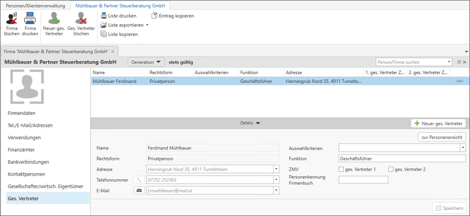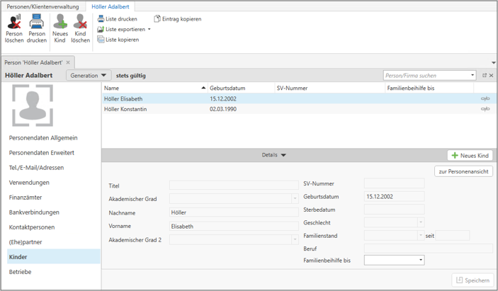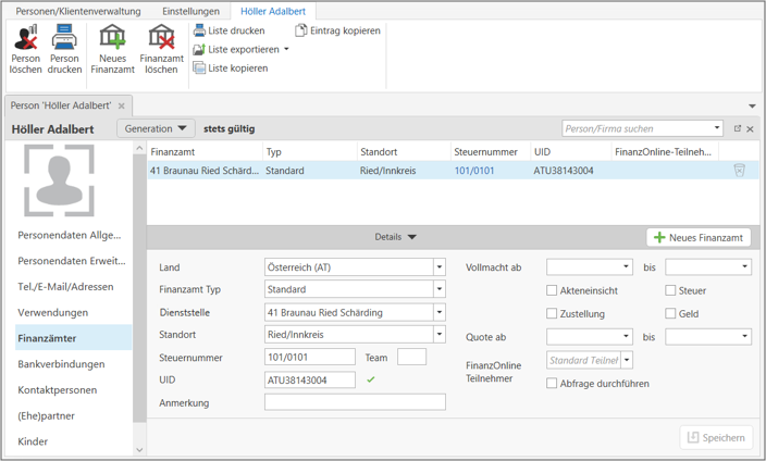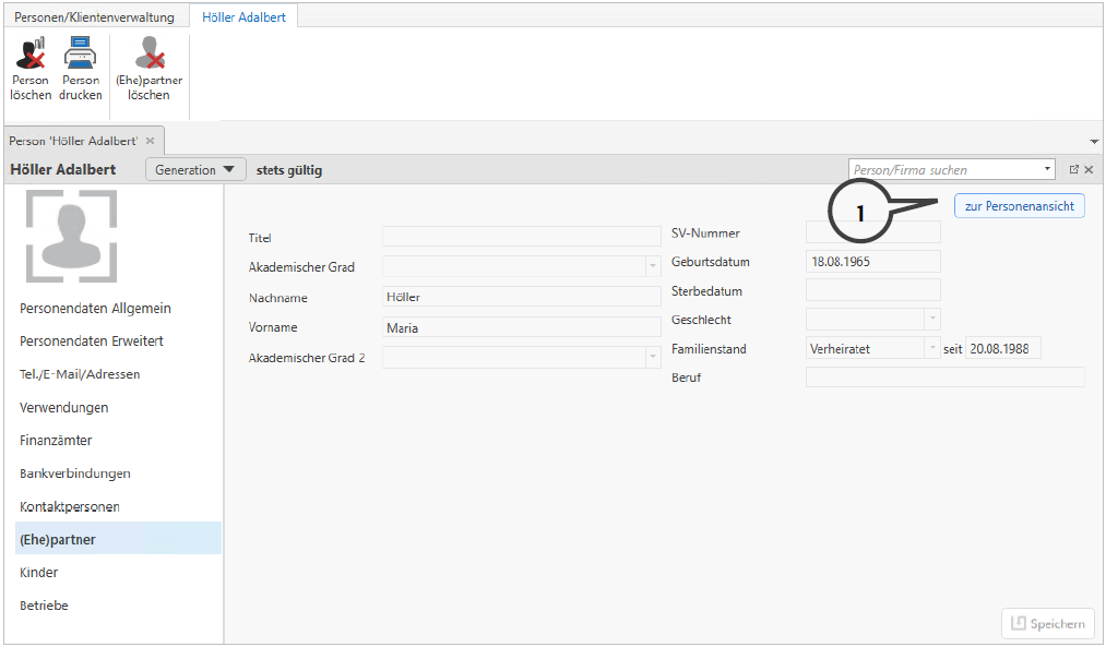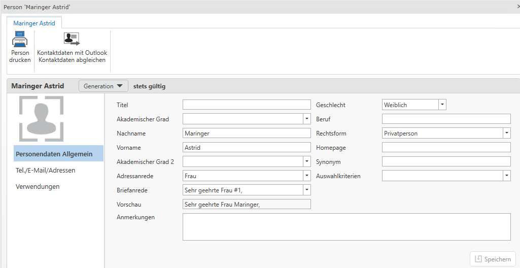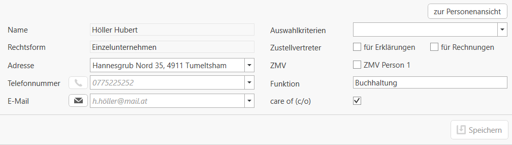 In der Startansicht werden die zentralen Personendaten angezeigt. Über die Leiste auf der linken Seite können die einzelnen Bereiche der Stammdaten der Person gewählt werden. Mittels Speichern werden die eingegebenen Daten übernommen. Die Übersicht (Liste) der Personen und Firmen bleibt in einem eigenen Tab offen. Durch Klick auf diesen Tab können weitere Personen/Firmen geöffnet werden.