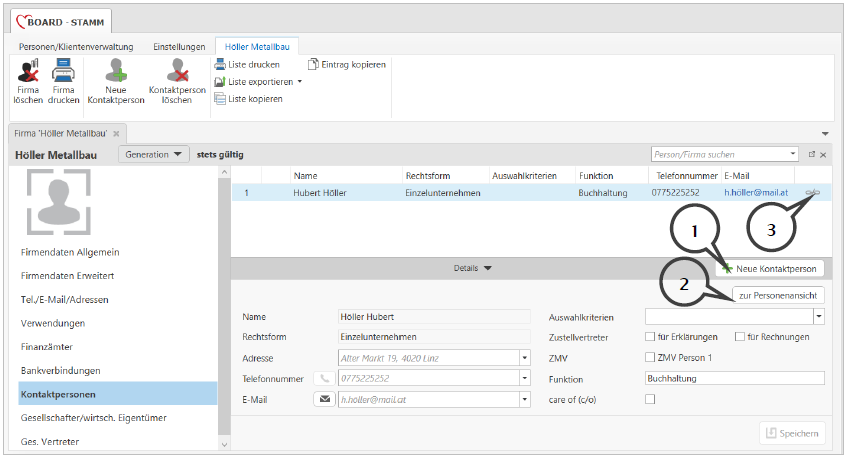 Hier können Sie beliebig viele Kontaktpersonen bei einer Person hinterlegen. Über die Schaltfläche Neue Kontaktperson (1) können Sie eine bestehende Person als Kontaktperson hinterlegen. Es wird dadurch die Person nicht neu angelegt, sondern „nur“ bei der Person als Kontaktperson eingetragen.