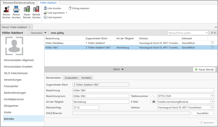 Die Bereiche Tel./E-Mail/Adressen, Verwendung, Finanzämter, Bankverbindungen und Kontaktpersonen unterscheiden sich nicht von der Ansicht der Personen.