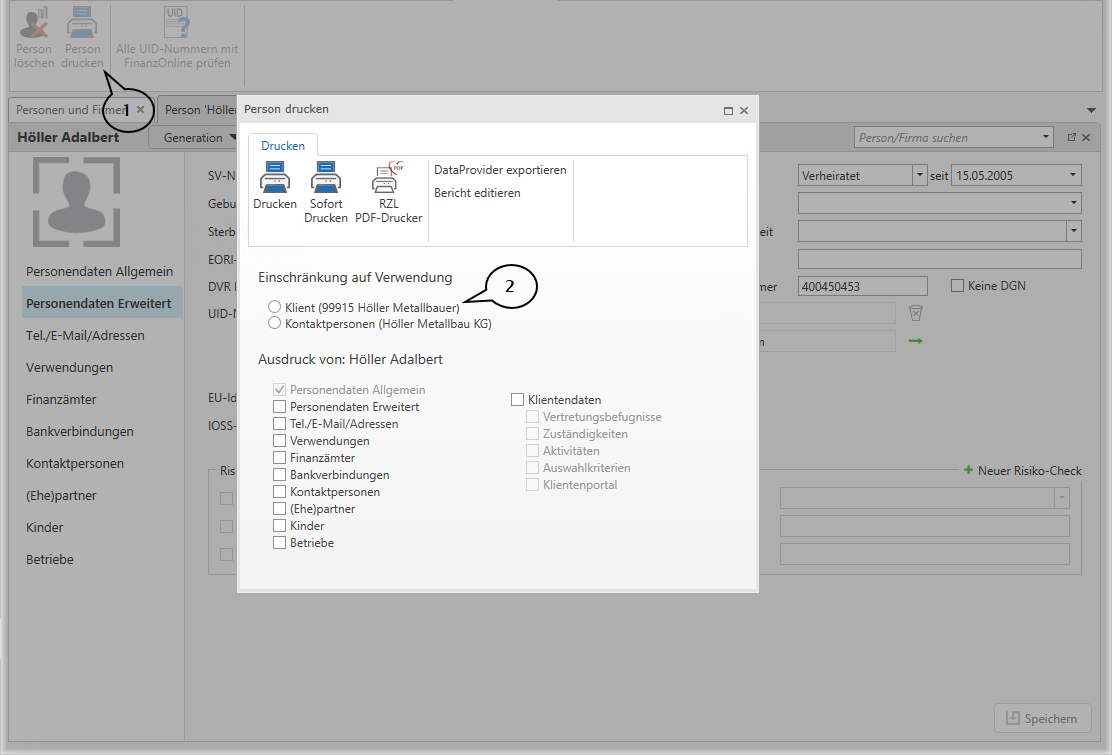 Nach Auswahl der Schaltfläche Person drucken (1) muss festgelegt werden, welche Daten der Person gedruckt werden sollen. Da es sein kann, dass die Person bei mehreren Klienten in unterschiedlichen Verwendungen verwendet wird, müssen Sie hier die Auswahl der entsprechenden Verwendung treffen (2). Daraufhin werden Ihnen die ausgewählten Register für den Druck an diese Auswahl angepasst.