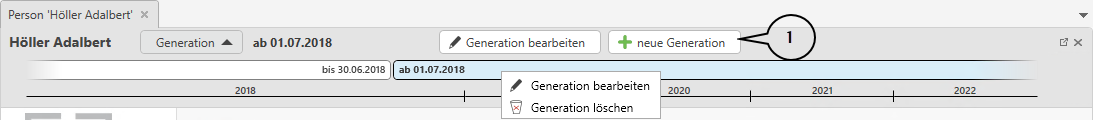 Die Anlage einer neuen Generation erfolgt über die Schaltfläche neue Generation (1). Die angelegten Generationen werden oberhalb einer Zeitleiste angezeigt und können durch Klicken auf den jeweiligen Bereich ausgewählt werden. Die Bearbeitung der Generation erfolgt über die Schaltfläche mit dem Bleistiftsymbol. Über das Kontextmenü können Sie die Generation ebenfalls bearbeiten bzw. löschen.