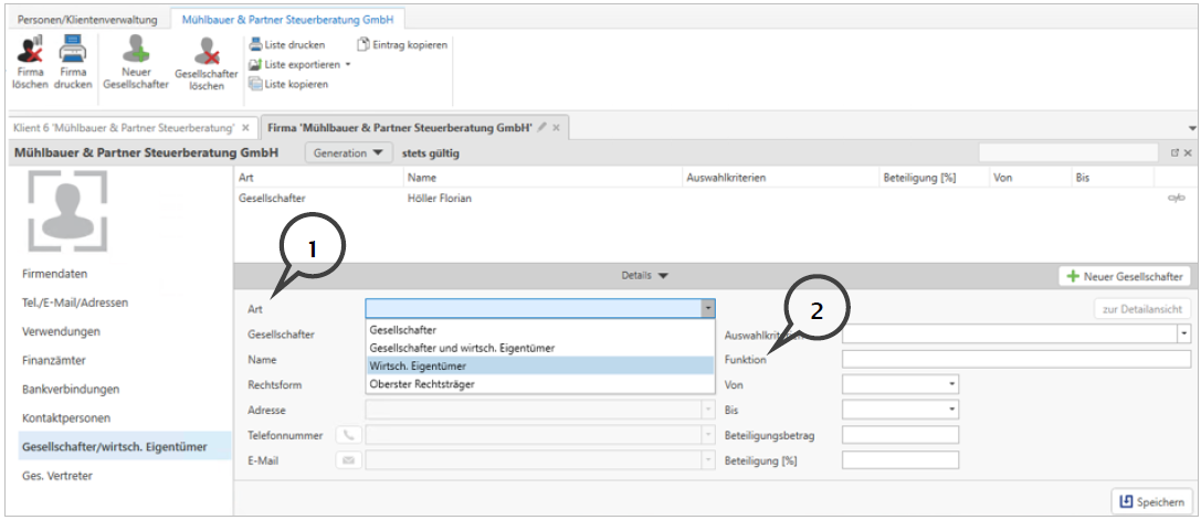 Wenn Sie die Art Gesellschafter und wirtschaftlicher Eigentümer oder wirtschaftlicher Eigentümer ausgewählt haben, so können im Anschluss nur natürliche Personen hinterlegt werden. Im Freitextfeld Funktion (2) haben Sie zusätzlich die Möglichkeit, Informationen zur Stellung des wirtschaftlichen Eigentümers (oder zum Gesellschafter) zu vermerken.
