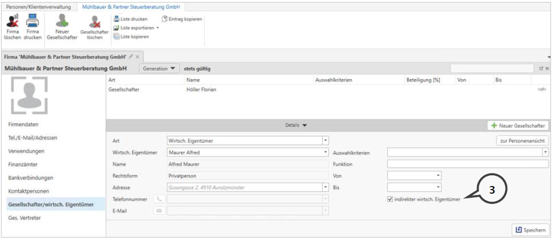 Handelt es sich um einen indirekten wirtschaftlichen Eigentümer (3), so können Sie dies in den Stammdaten eines wirtschaftlichen Eigentümers hinterlegen.