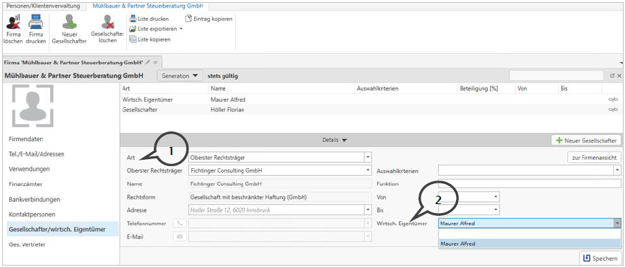 Im Register Gesellschafter/wirtschaftlicher Eigentümer können neben den Gesellschaftern auch wirtschaftliche Eigentümer und oberste Rechtsträger erfasst werden.