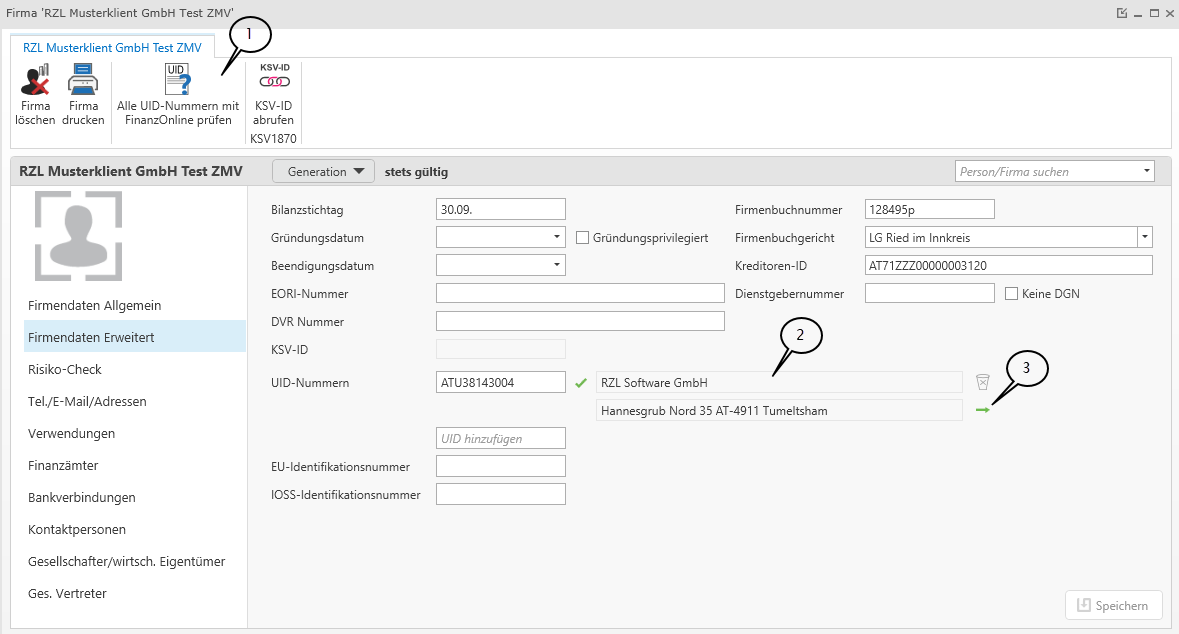 Die UID-Nummer eines Klienten kann bei Personen in der Registerkarte Personen Erweitert und bei Firmen unter Firmendaten Erweitert überprüft werden. Wählen Sie dazu Alle UID-Nummern mit FinanzOnline prüfen (1) aus.