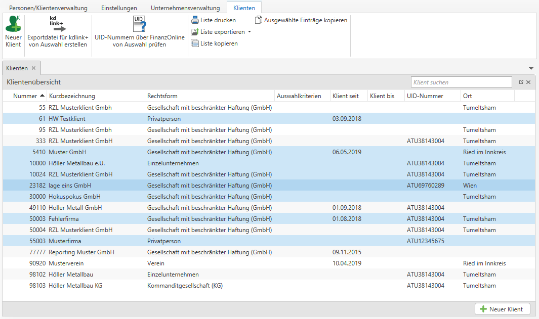 Möchten Sie mehrere UID-Nummern auf einmal überprüfen, so können Sie die gewünschten Klienten über die Klientenliste bzw. in der Personen und Firmen Übersicht filtern (mit STRG + A markieren) und anschließend mit UID-Nummern über FinanzOnline von Auswahl prüfen überprüfen lassen.