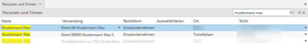 Die jeweiligen Verwendungen einer Person werden in einer eigenen Spalte dargestellt. Liegen bei einer Person mehrere Verwendungen vor (z.B. als Kontaktperson eines Klienten und als Gesellschafter eines anderen Klienten) kann über das Dreiecksymbol (1) die Liste aller Verwendungen aufgeklappt werden.