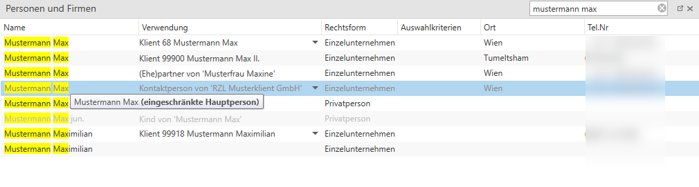 Die Person „Mustermann Max“ gibt es in der Stammdatenverwaltung einmal als gesperrte Person mit der Verwendung Klient (Bearbeitung Person möglich) und weiterhin als Person für die Verwendung als Kontaktperson (Bearbeitung Person nicht möglich).