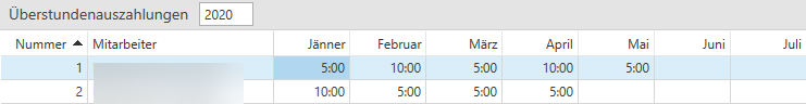 Sie können einfach mittels Doppelklick in das jeweilige Monat die Überstunden eintragen, die ausbezahlt wurden. Mit der Enter-Taste am Ziffernblock können Sie zum nächsten Mitarbeiter im gewählten Monat wechseln. Wenn Sie die Tabulator-Taste drücken, springt der Fokus zum nächsten Monat beim selben Mitarbeiter.