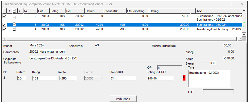 Das Verbuchen von Anzahlungsnoten ist auch bei ausländischen Klienten möglich. Jedoch wird hier die Anzahlungsnote auf das in den Grundeinstellungen hinterlegte Konto für Anzahlungen (ig. Leistung / Reverse Charge) mit dem Code M03 oder M02 verbucht.