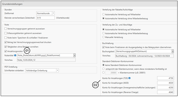 Möchte man über HON Next Anzahlungsnoten erstellen, muss zuerst im HON Next über Einstellungen / Grundeinstellungen die Option Anzahlungsnoten (1) aktiviert werden. Zusätzlich sind in den Grundeinstellungen die Anzahlungskonten (2) zu hinterlegen.