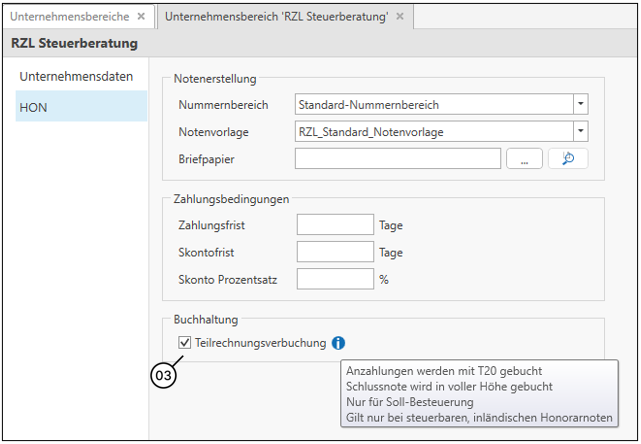 Weiters kann über Stamm / Unternehmensverwaltung / Unternehmensbereiche bei den jeweiligen Unternehmensbereichen im Reiter HON die Option Teilrechnungsverbuchung (3) aktiviert werden.