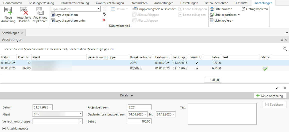 Steigen Sie über Akonto/Anzahlungen / Anzahlungen ein. Mit der Schaltfläche Neue Anzahlung können Sie eine neue Anzahlung anlegen. Eine Anzahlungszeile besteht aus den folgenden Feldern: Datum, Klient, Verrechnungsgruppe, Projektzeitraum, geplanter Leistungszeitraum und Betrag.