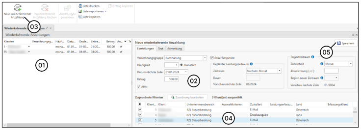 Nachdem Sie die Anzahlungszeile angelegt haben, können Sie direkt unterhalb (4) die Klienten zuordnen.